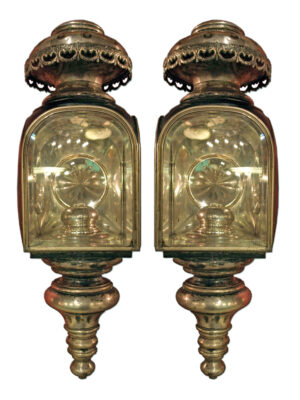 Pair of gilt bronze lanterns with cut and frosted glass on brackets