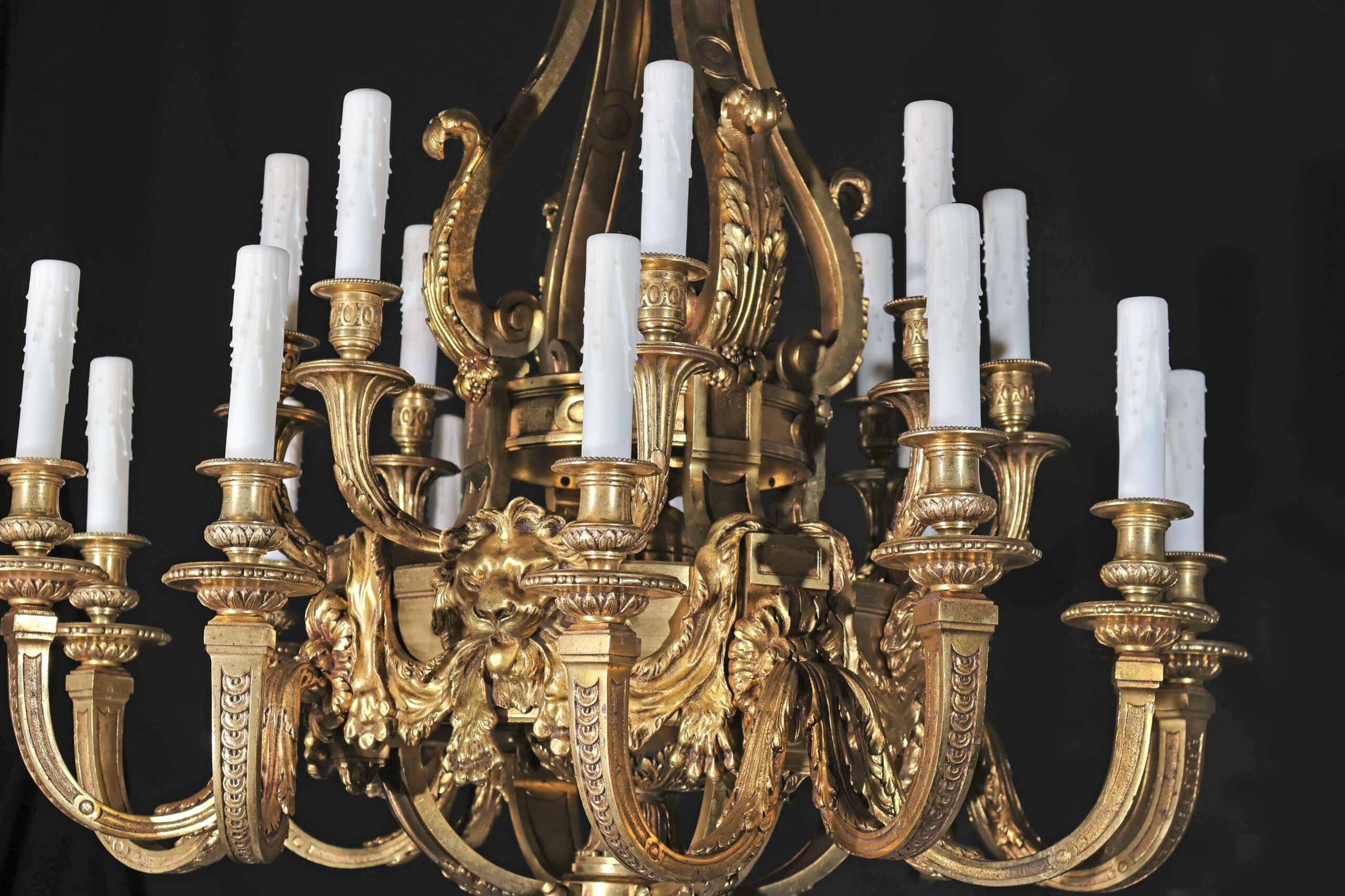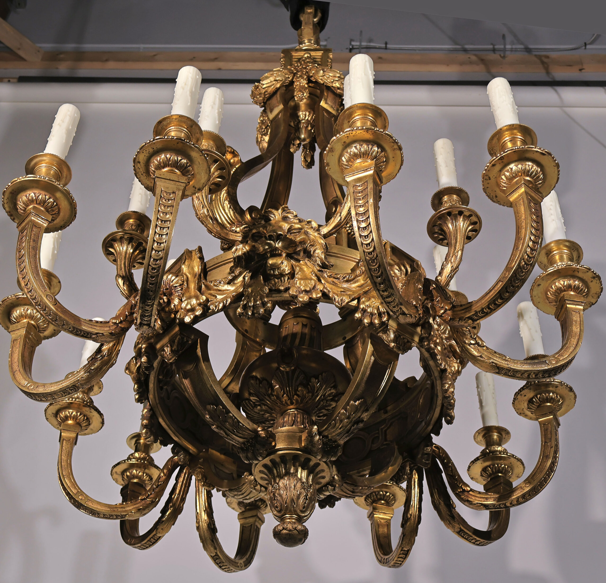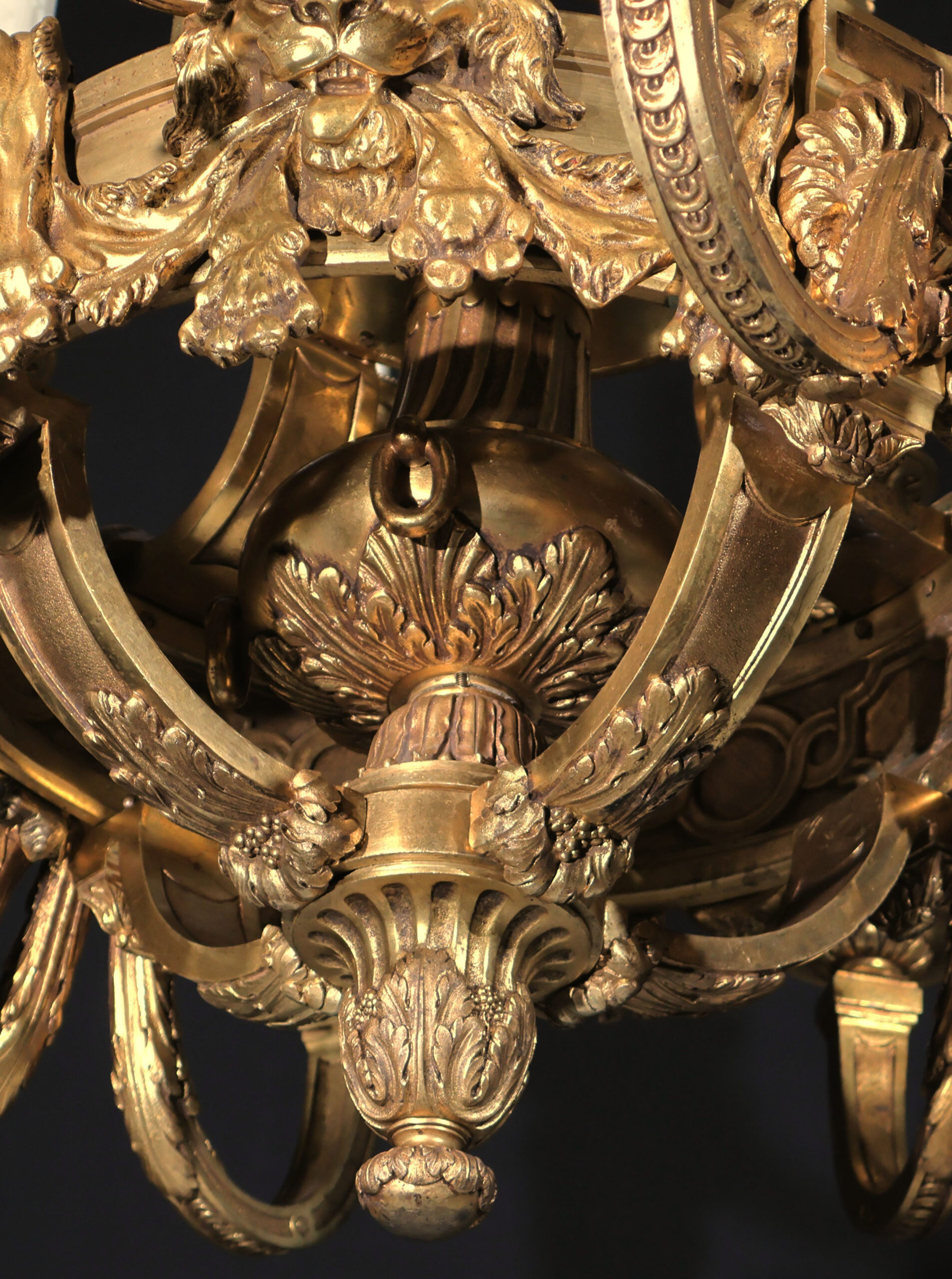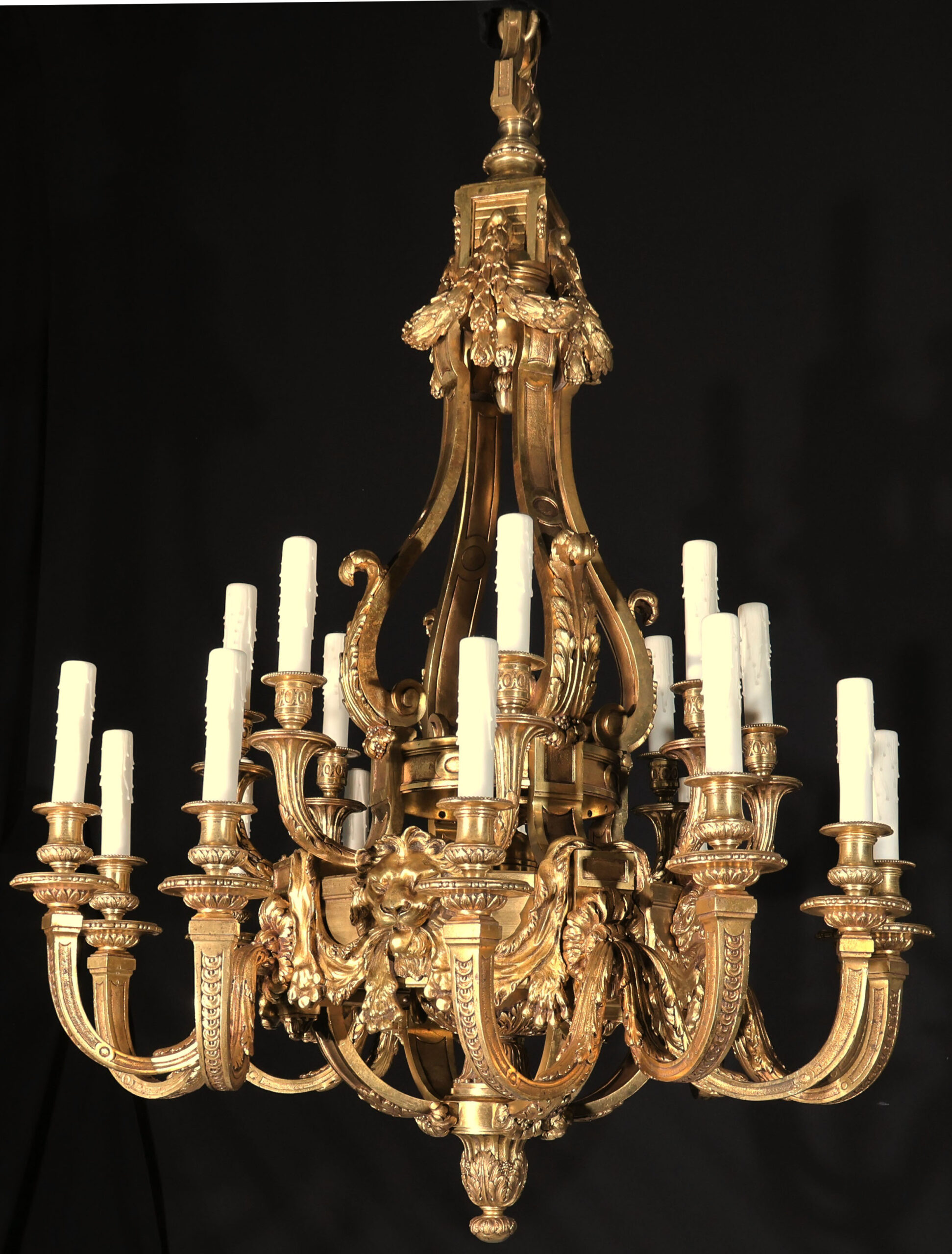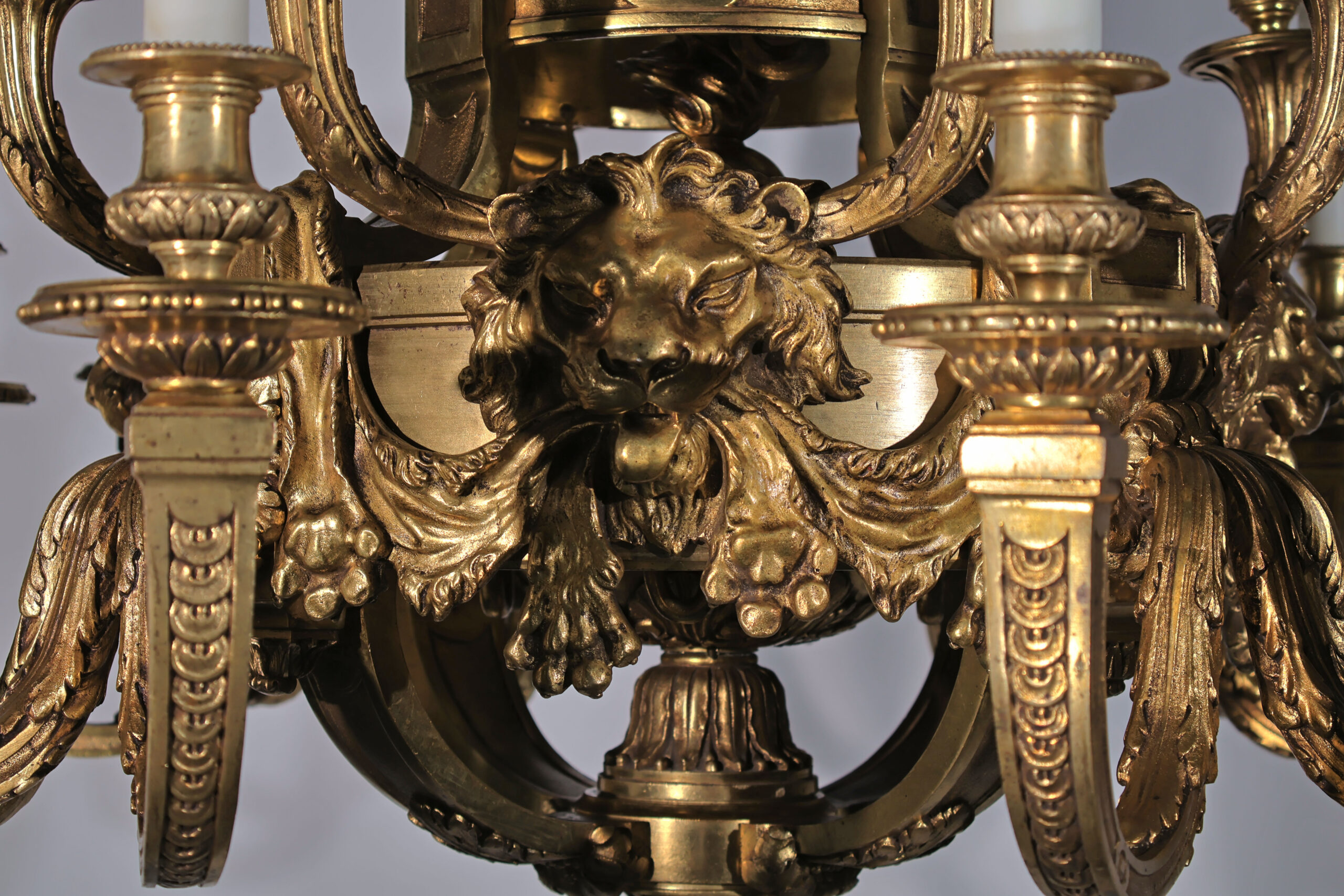 A Magnificent Gilt Bronze Chandelier depicting Lions Pelts in the Regence Taste.