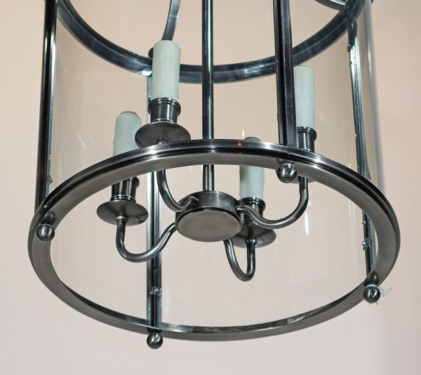 A Very Fine Modern Four Light Cylindrical Lantern. Original Curved Glass Panels. Brushed Steel Finish. Pair available