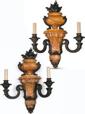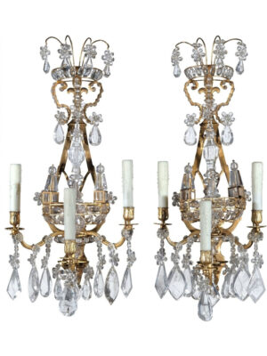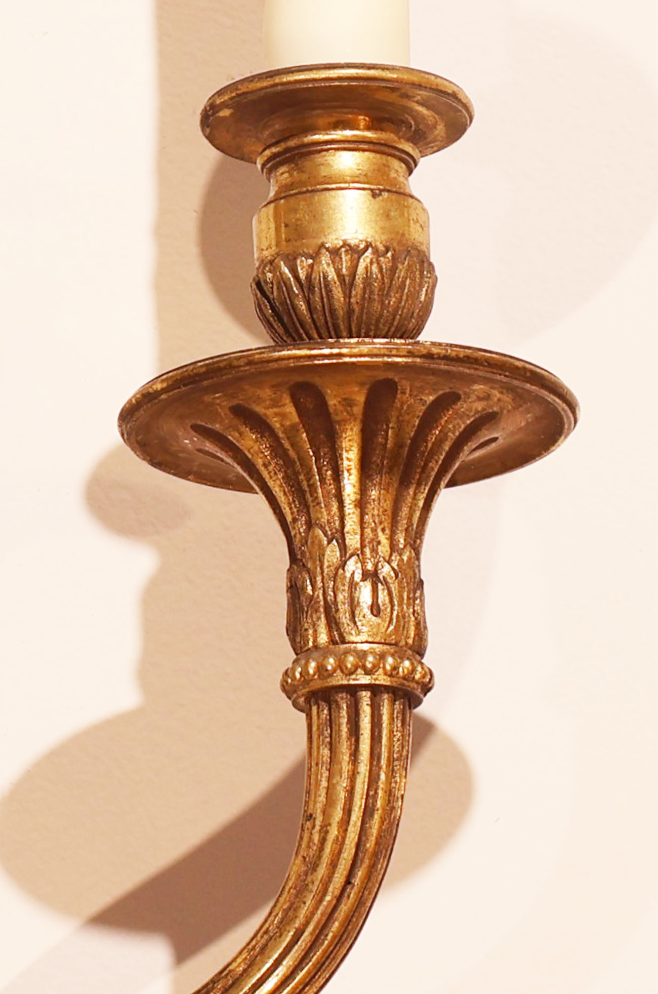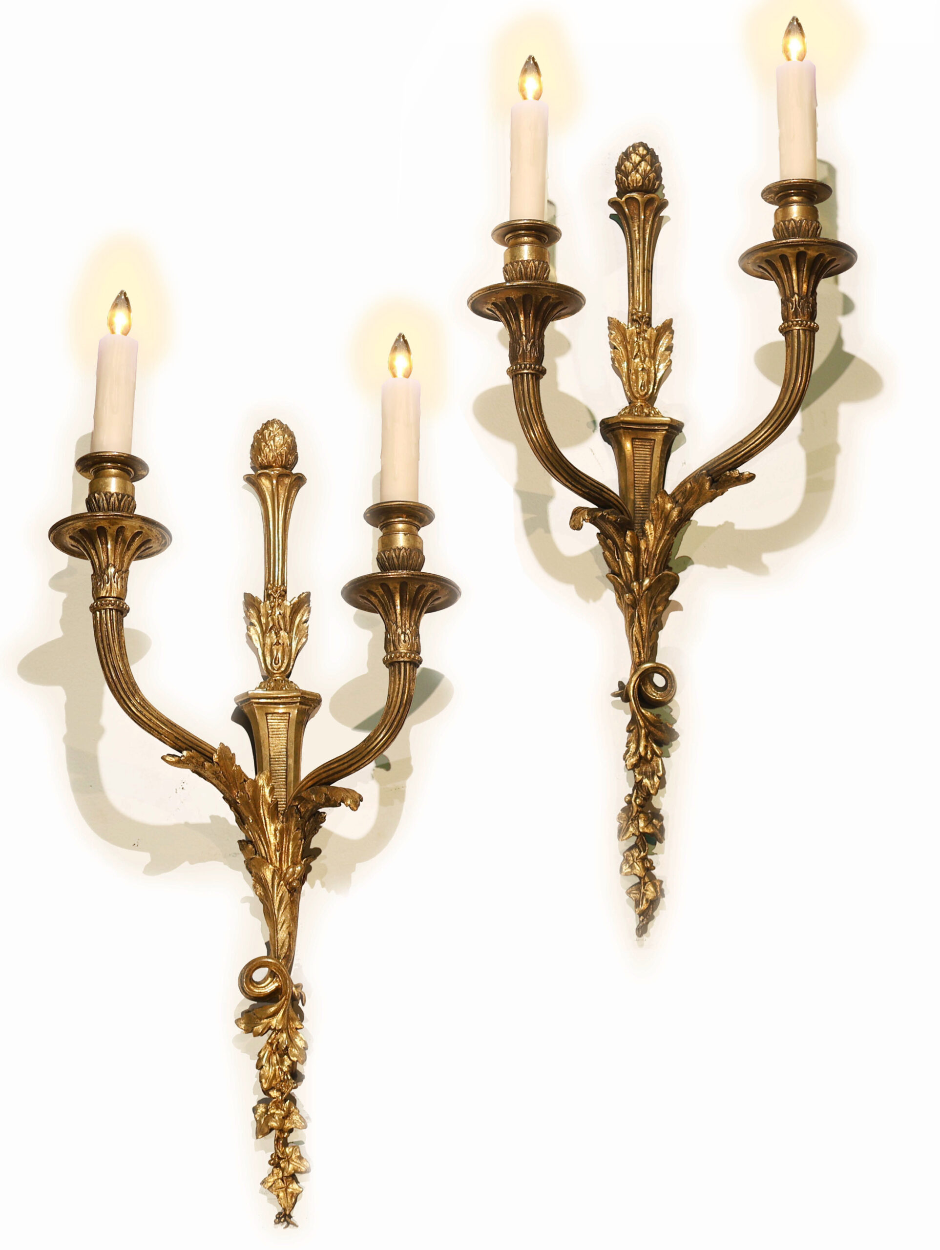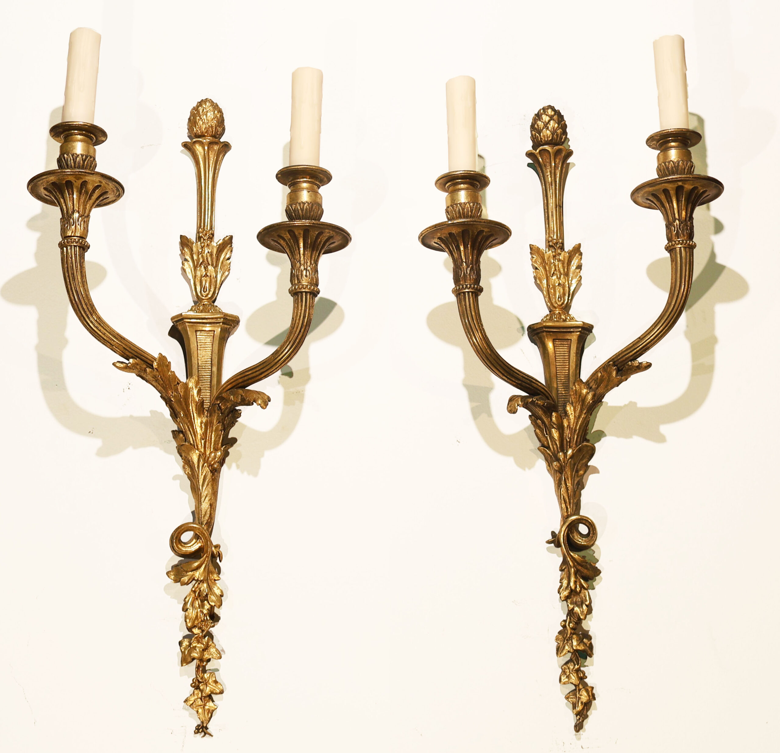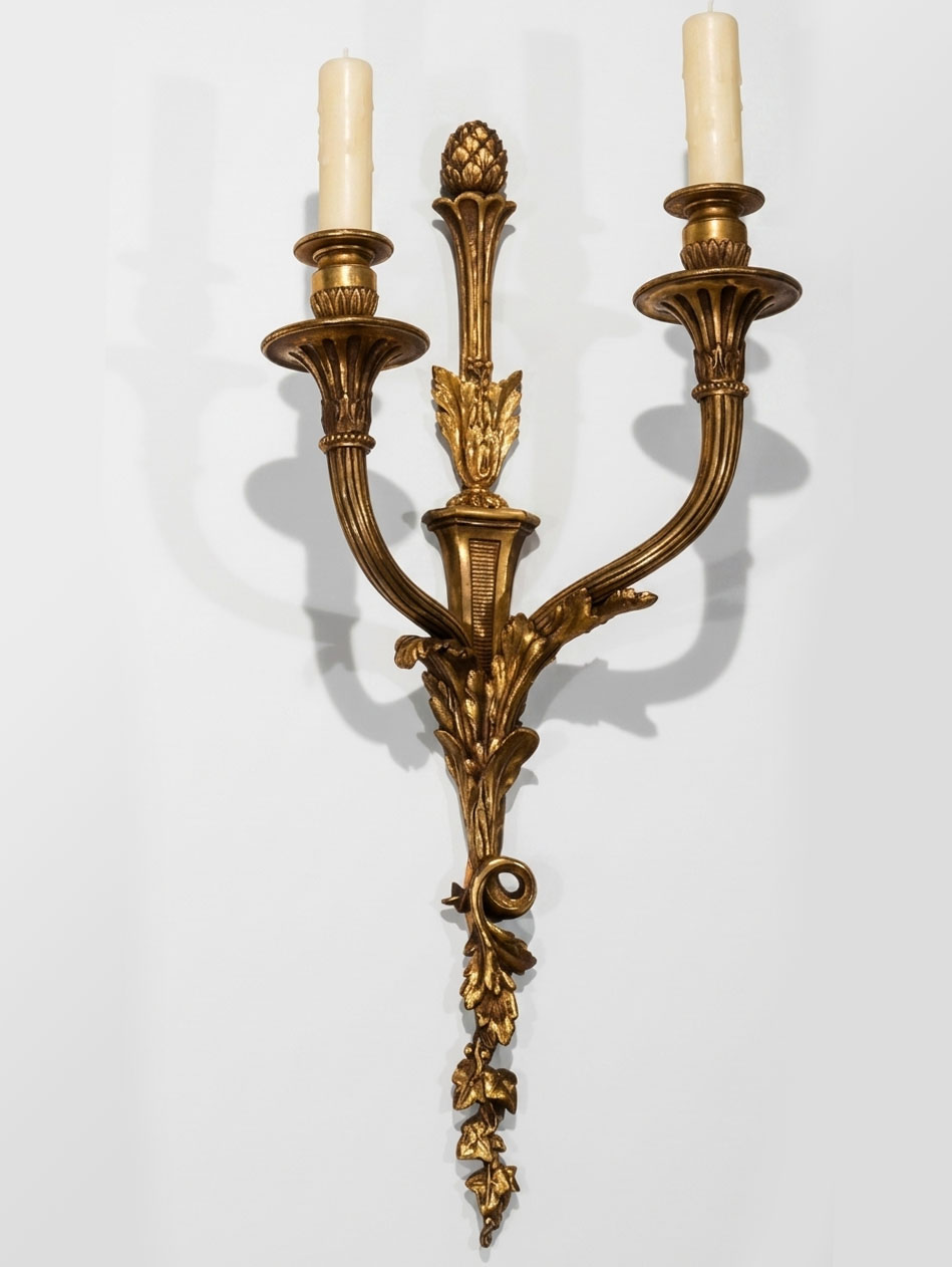 A Very Fine Pair of Gilt Bronze Wall Sconces in the Louis XVI taste. Original mat & burnish gold. Good Detail. France, circa 1910.