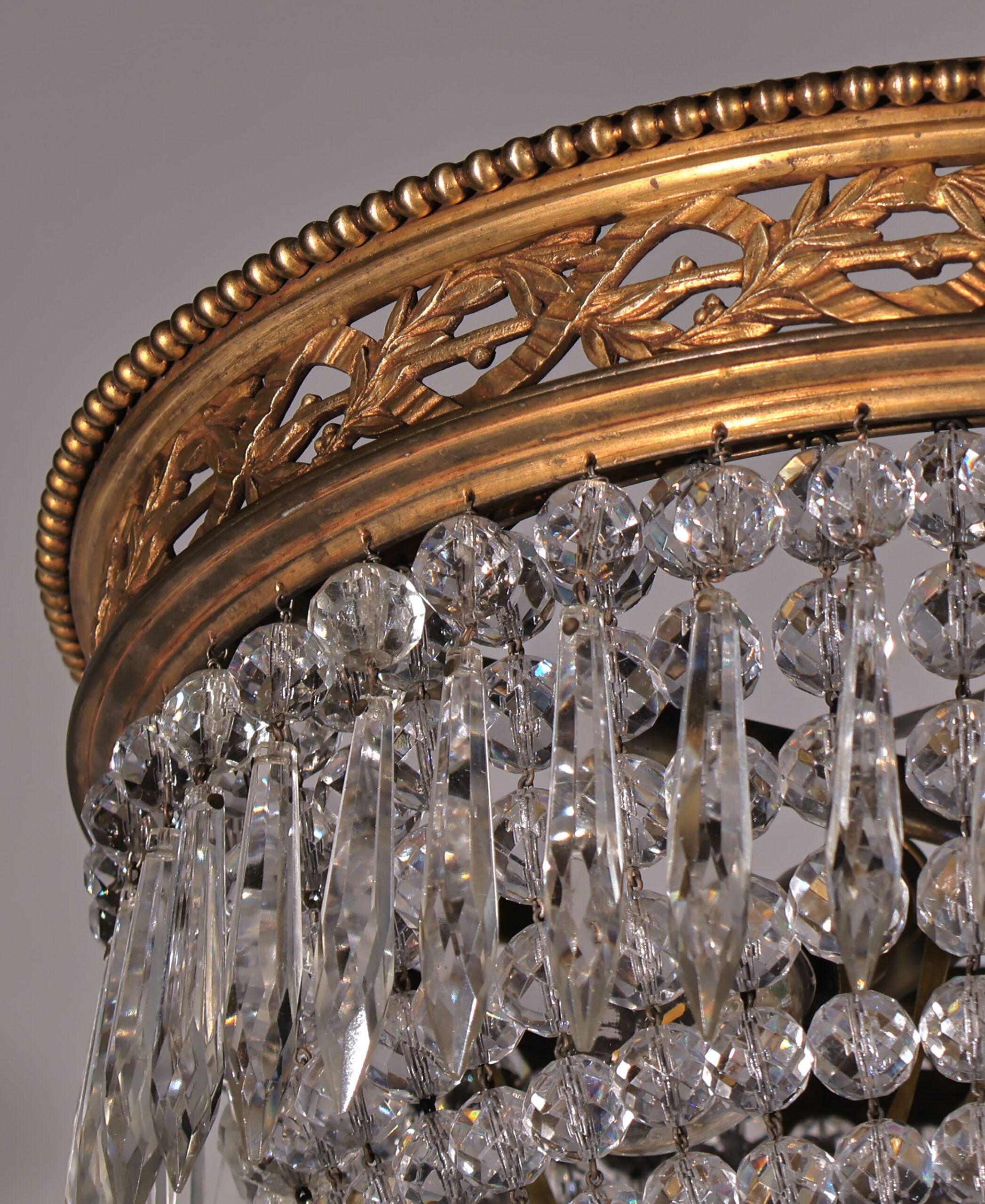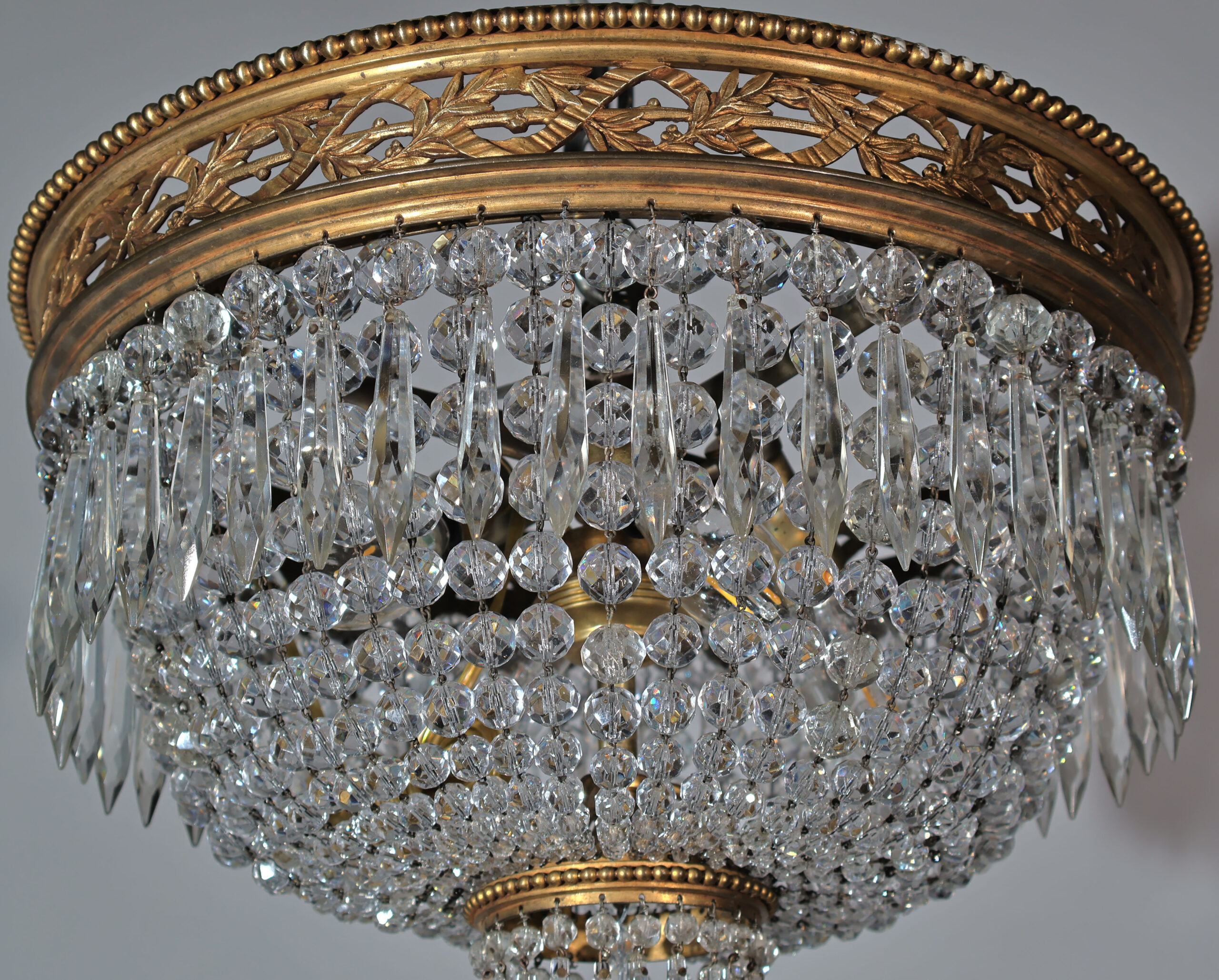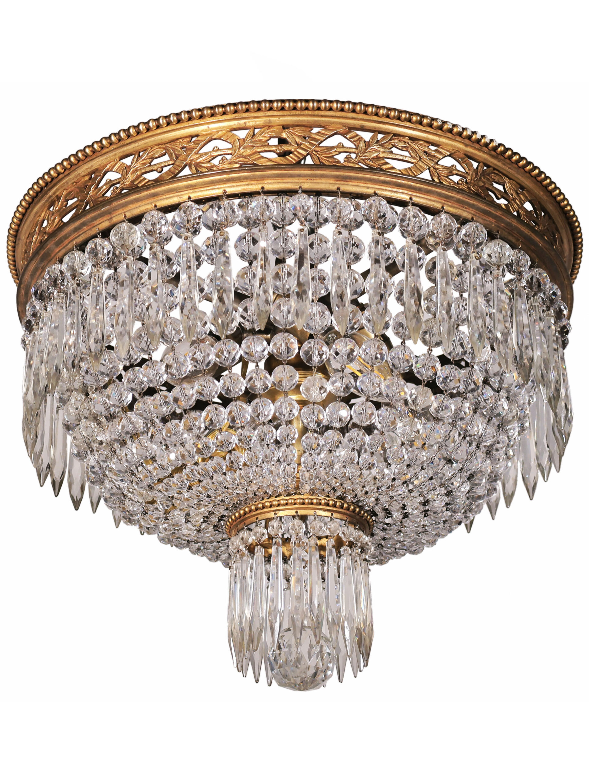 A Very Fine GIlt Bronze & Crystal Pendant by Baccarat. Great Gilt Bronze Chasing & Detail in the circle. 4 lights. Louis XVI stlyle. France, circa 1910.
