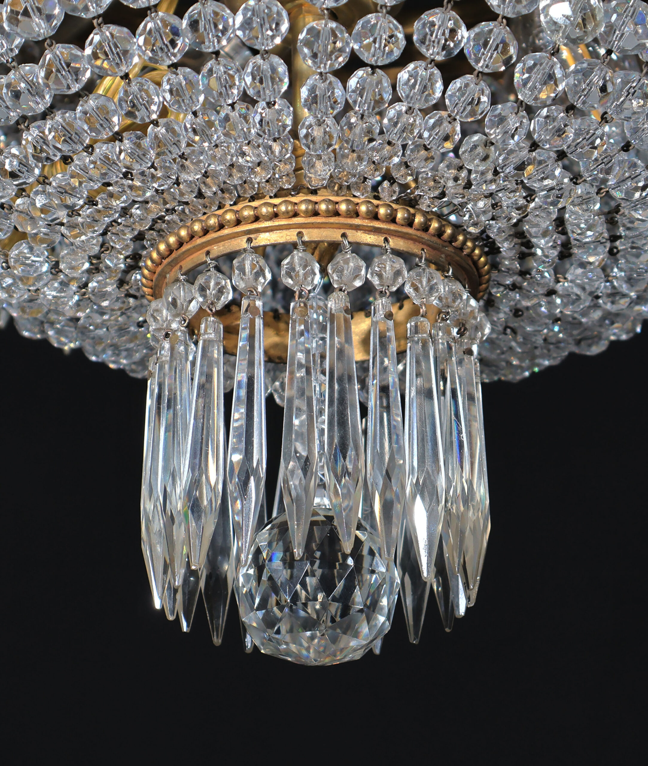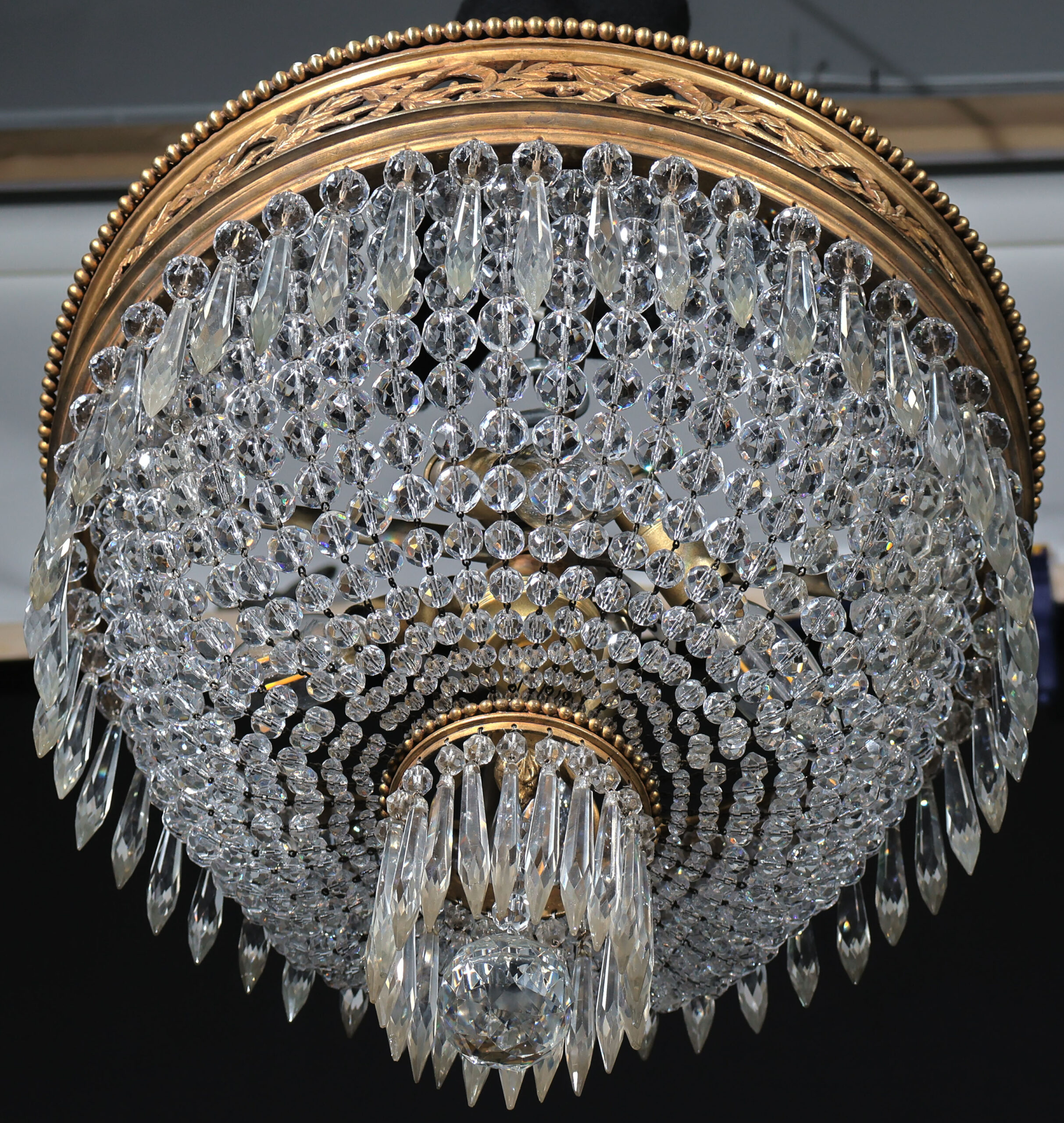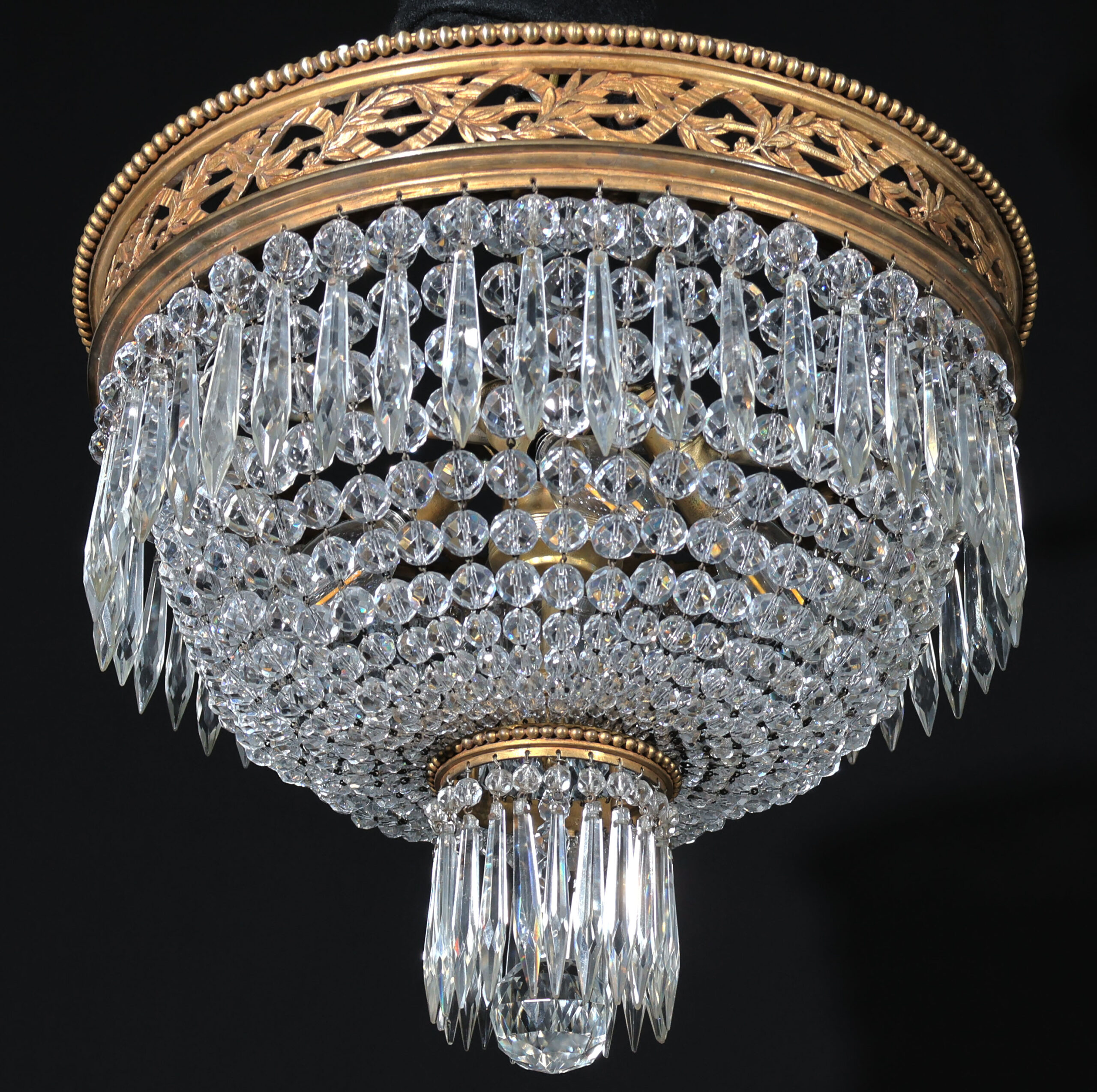 A Very Fine GIlt Bronze & Crystal Pendant by Baccarat. Great Gilt Bronze Chasing & Detail in the circle. 4 lights. Louis XVI stlyle. France, circa 1910.