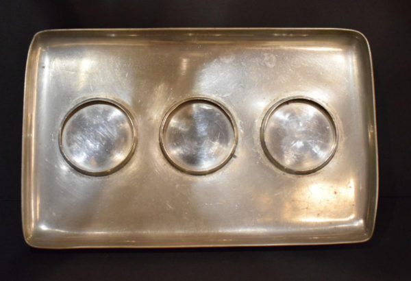 An English Pewter Inkwell, 19th century, the dished rectangular tray with two cylindrical ink pots and a covered jar, raised on animal paw feet.
