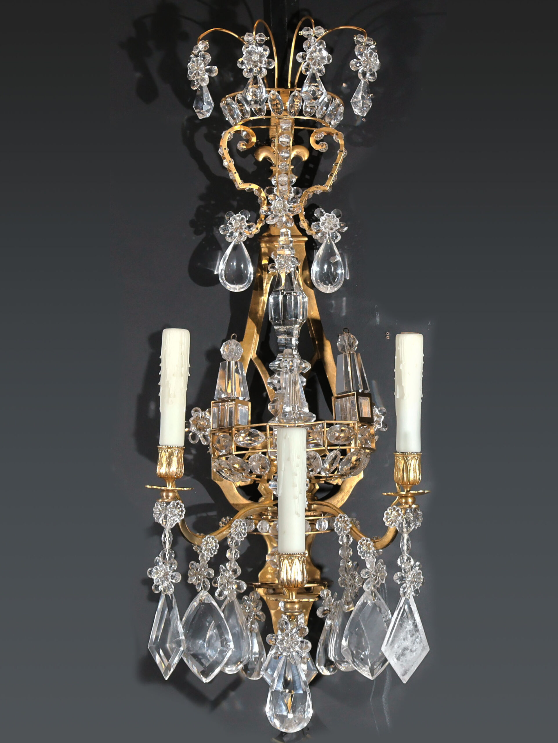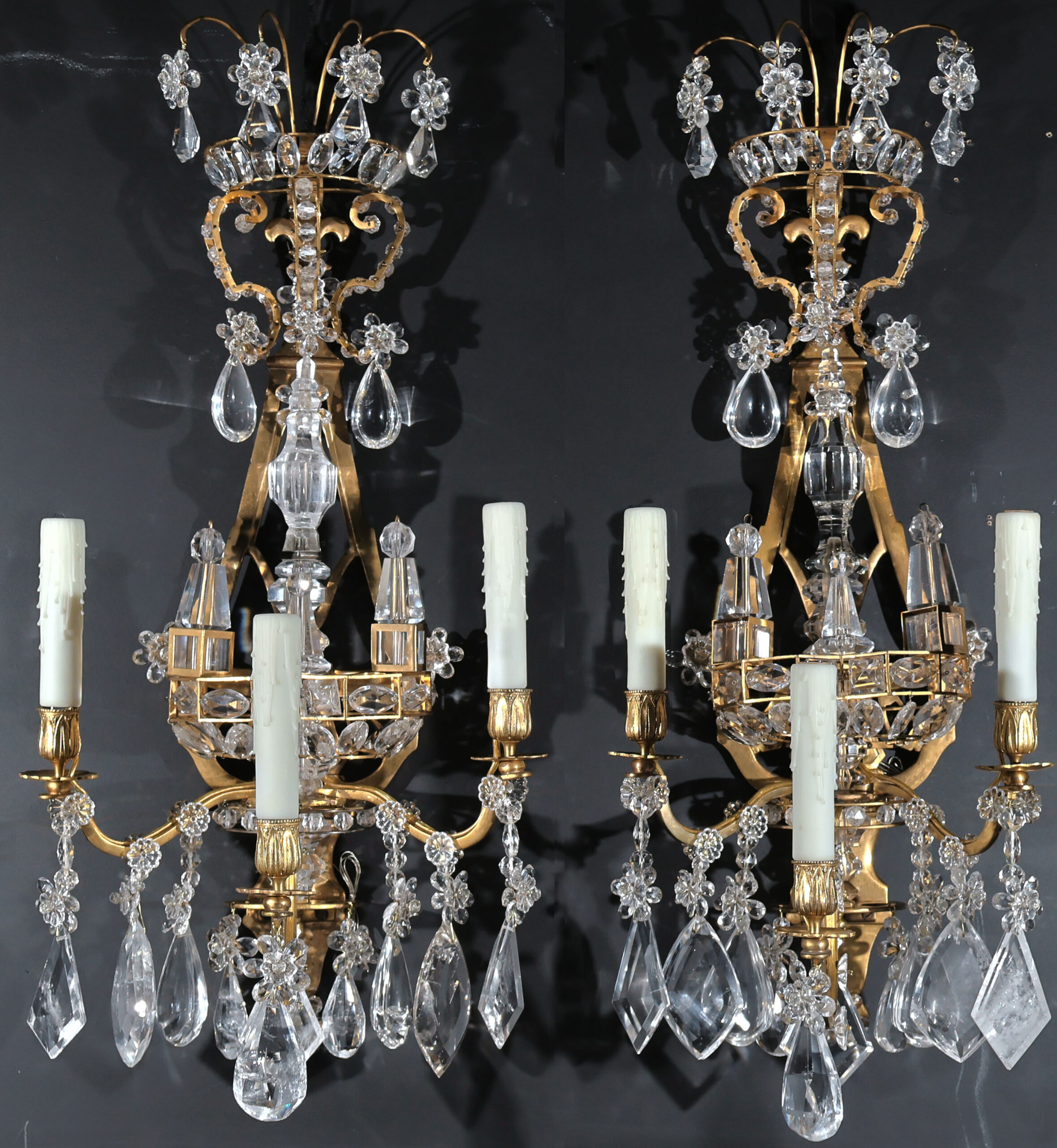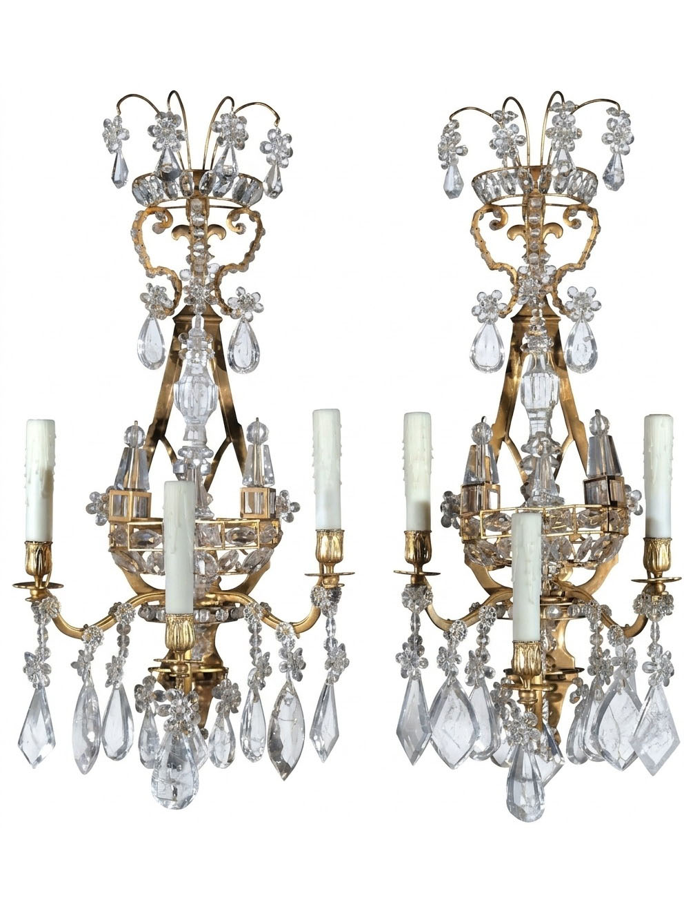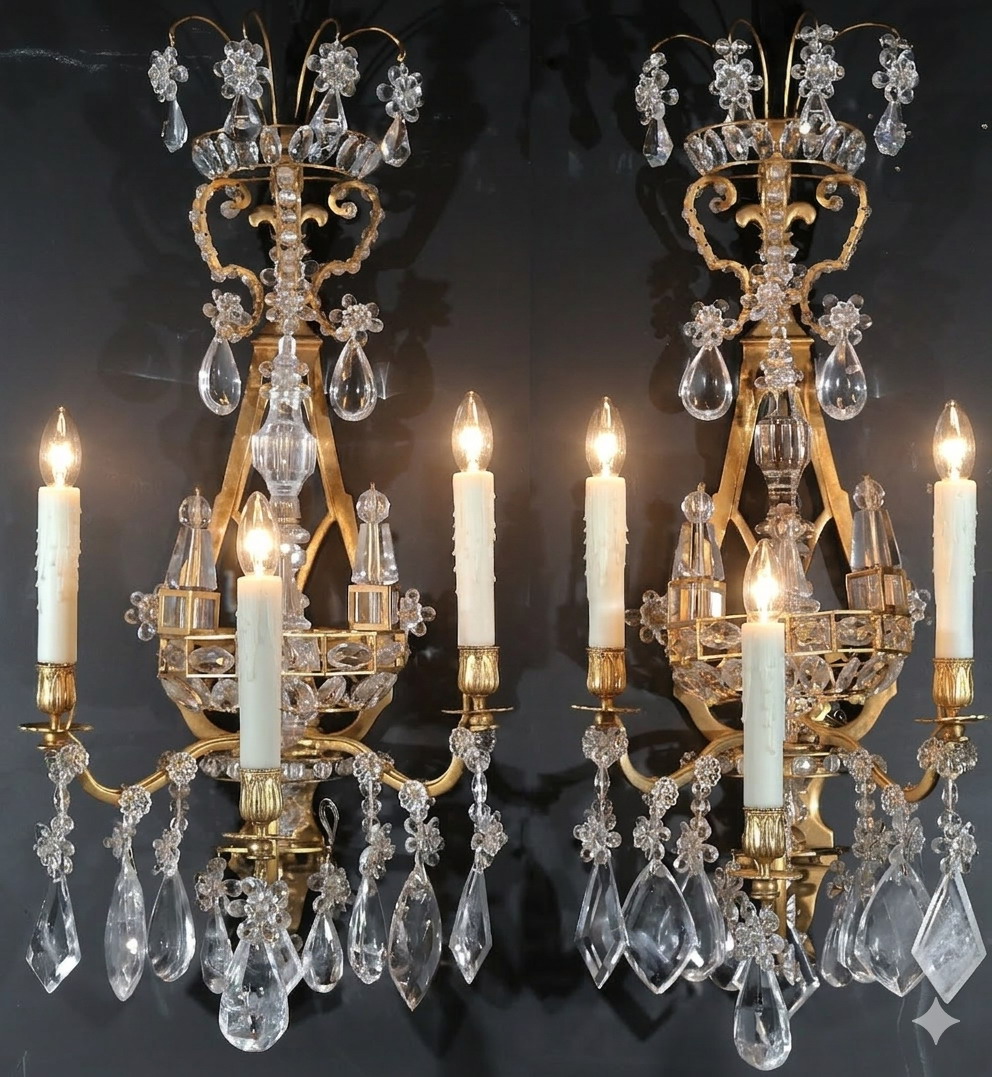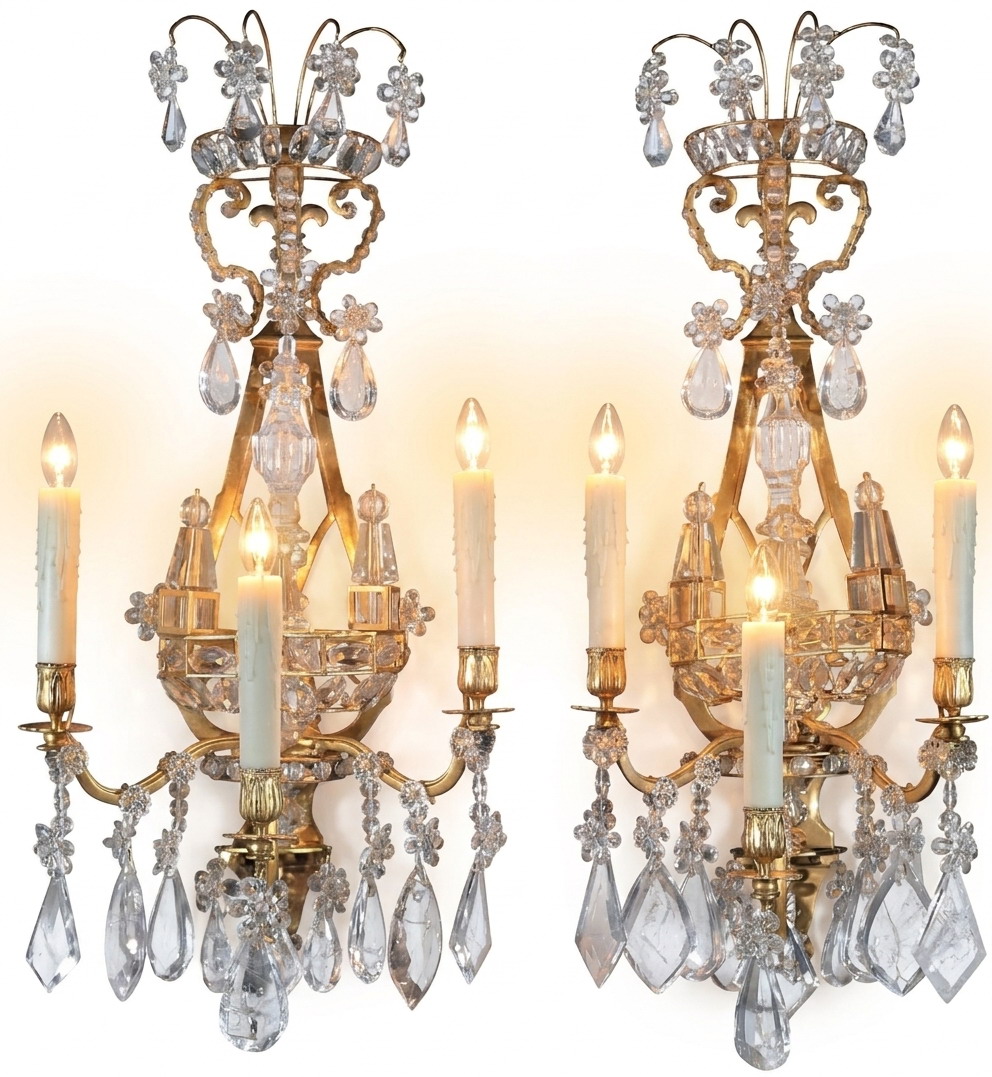 Exquisite Pair of Gilt Bronze & Rock Crystal Wall Sconces in the Neoclassical style. France, circa 1900. 3 lights each.