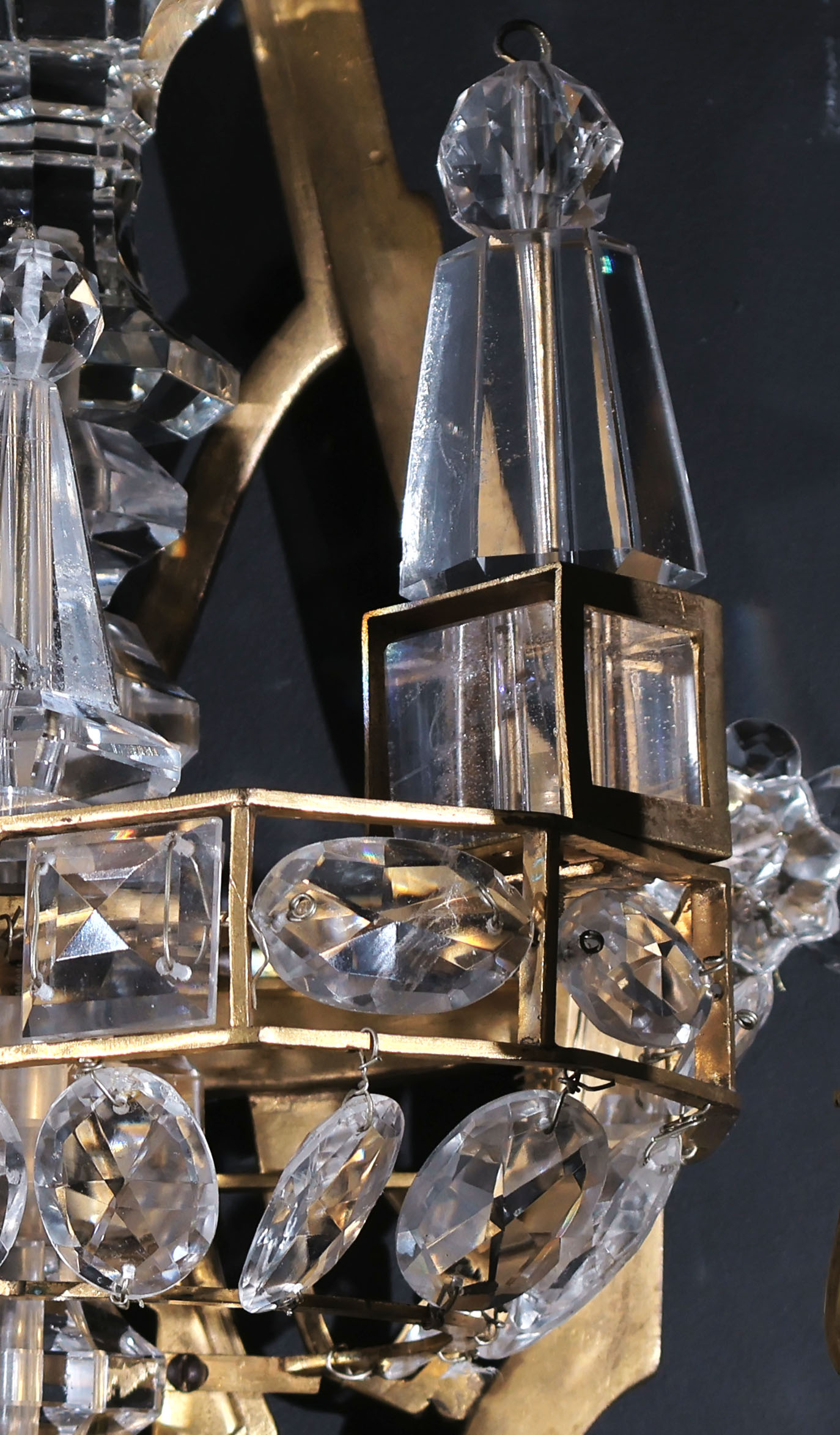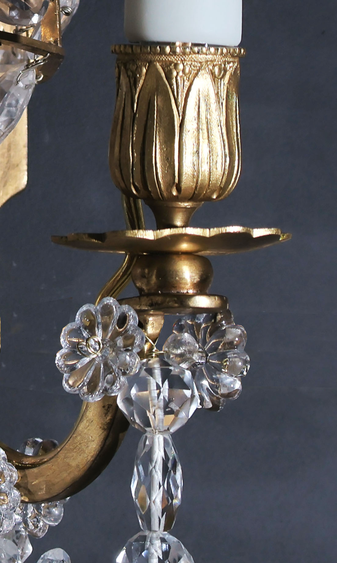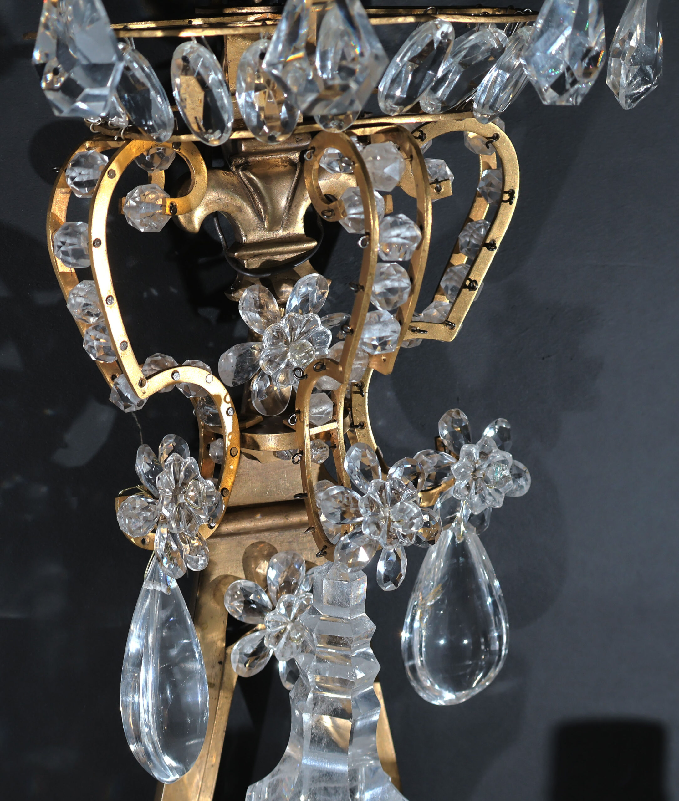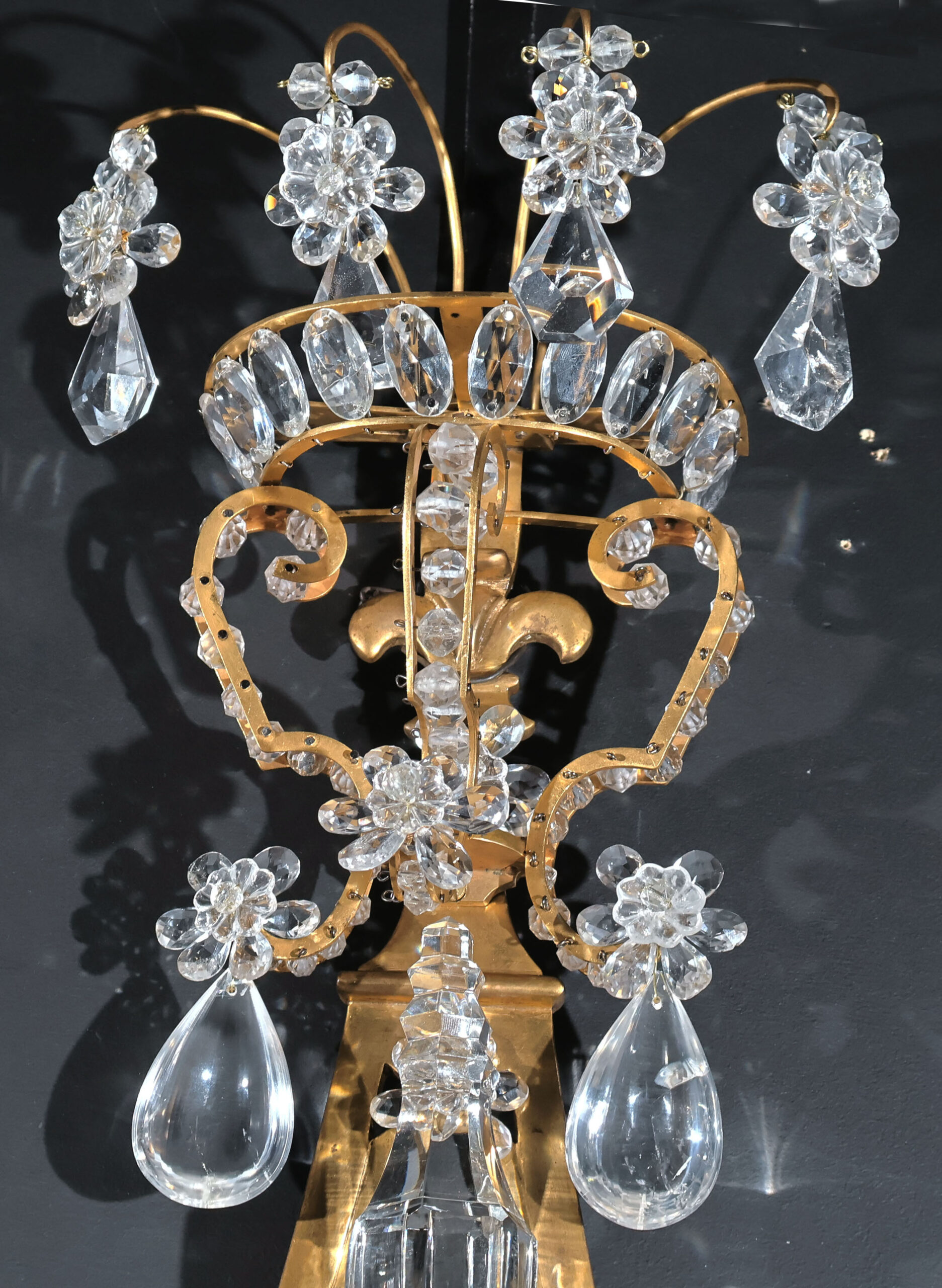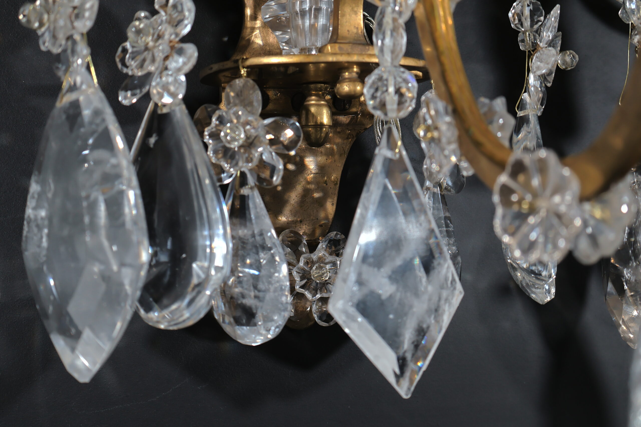 Exquisite Pair of Gilt Bronze & Rock Crystal Wall Sconces in the Neoclassical style. France, circa 1900. 3 lights each.