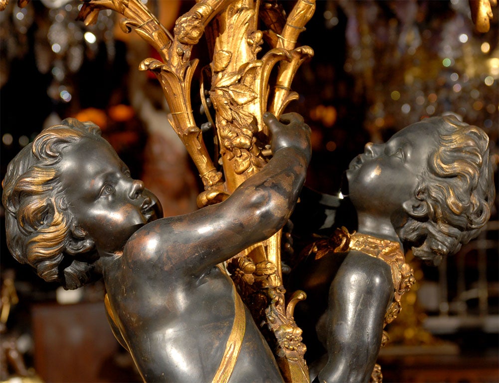 A superb pair of five-light gilt and patinated bronze electrified candelabrum featuring cherubs supporting a naturalistic branch type candelabra signed “Forest Paris.”