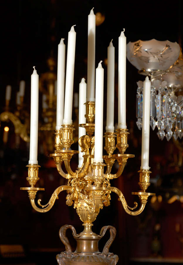 Impressive pair of gilt and patinated bronze candelabra, having eight arms and with neoclassical scenes in relief, with Rouge Griotte bases, signed Barbedienne.
