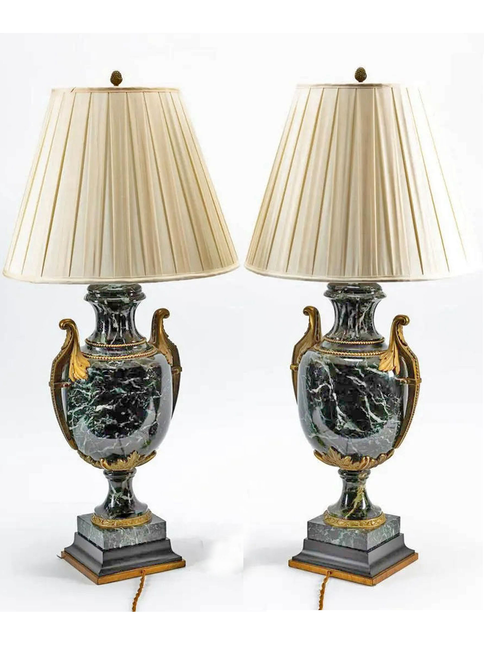 A Very important pair of gilt bronze mounted Vert des Alpes marble urns, now fitted as lamps in the Louis XVI taste, on socle plinths with square bases.