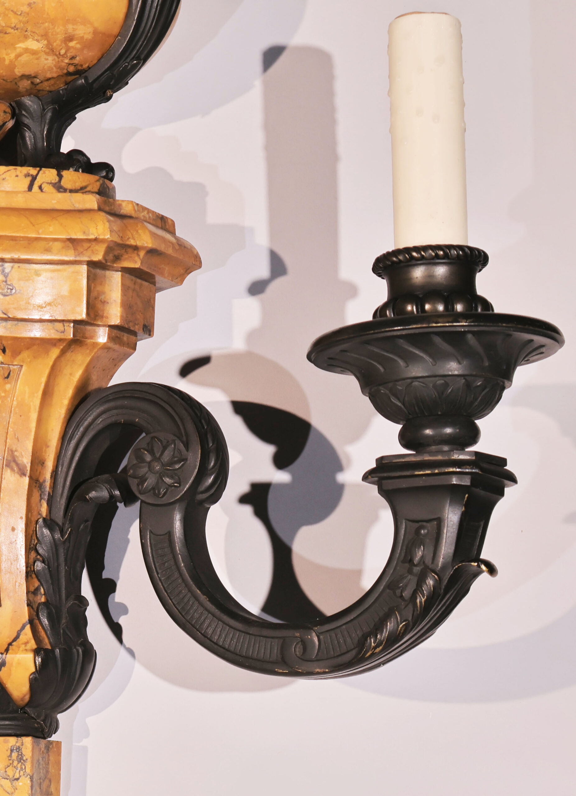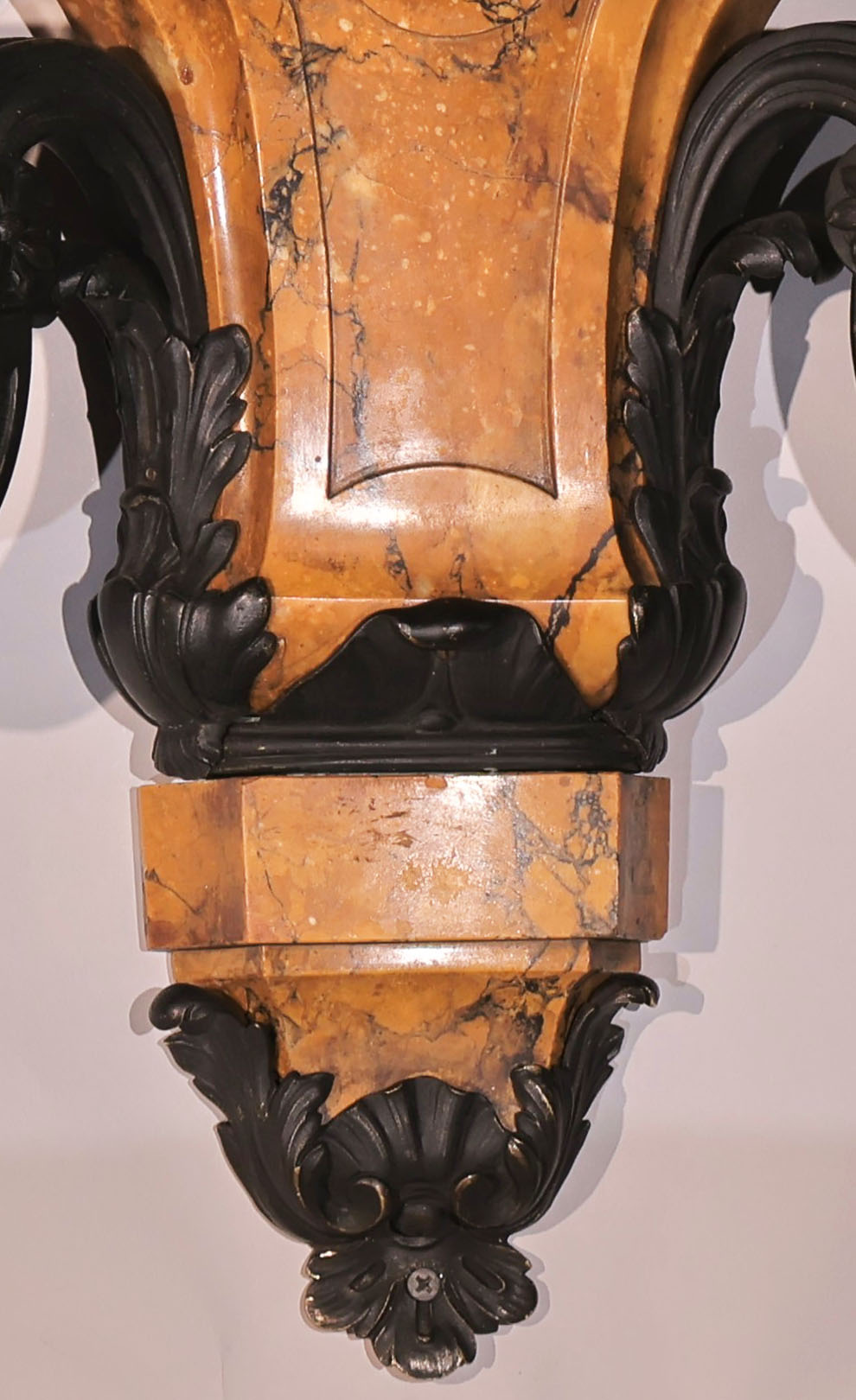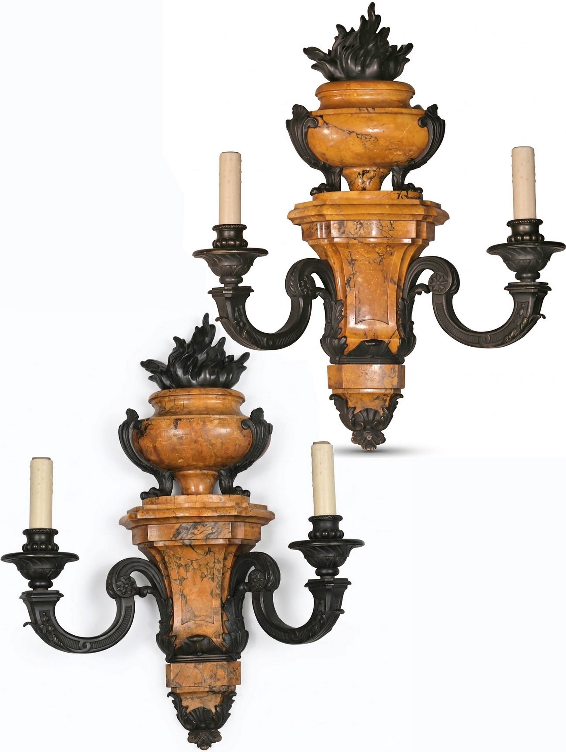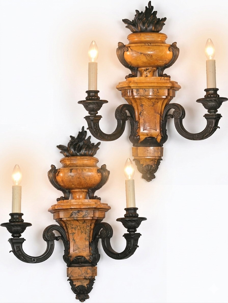 A Very Fine Pair of Siena Marble & Bronze, Two Light Wall Sconces in the Louis XIV taste.
