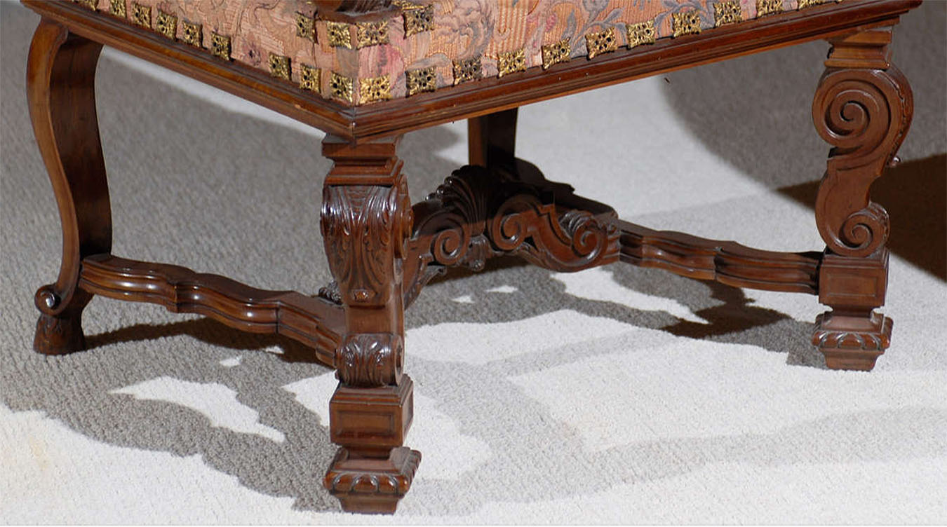 Set of 14 monumental armchairs, beautiful hand carved mahogany with bronze ornamentation.