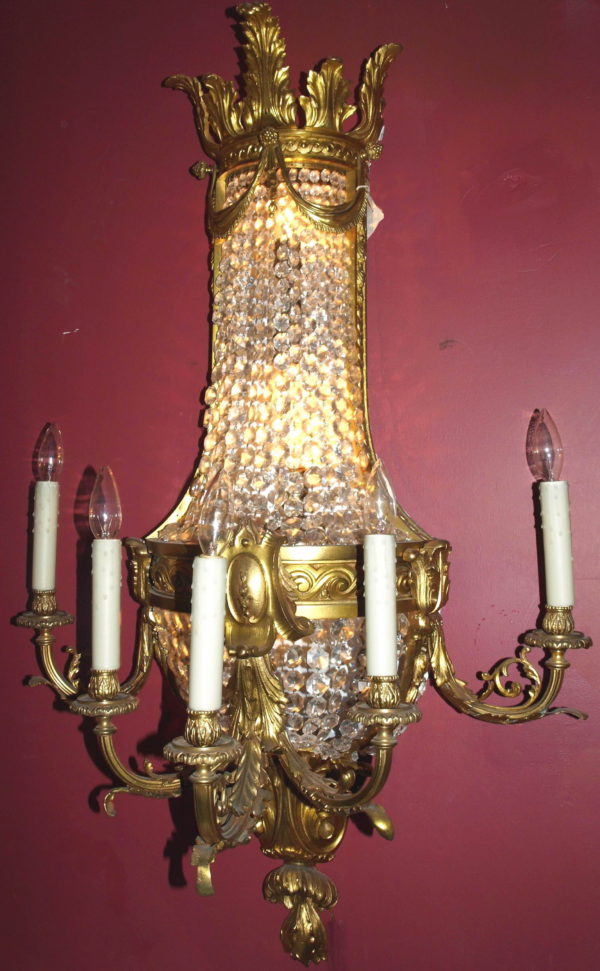 Very elegant pair of gilt bronze and crystal wall sconces having five lighted arms and five internal lights each.