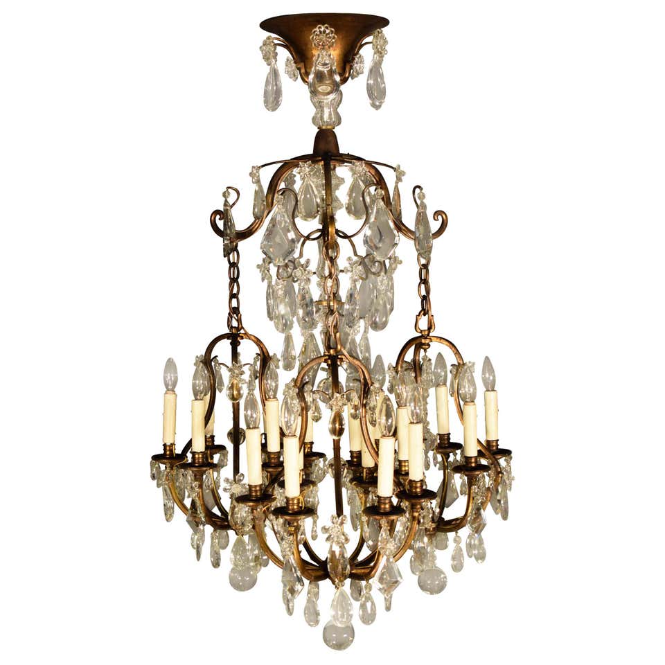 A very fine gilt bronze and crystal chandelier. Underneath the top canopy is a distribution box ( prolonged underneath by a shaft ) issuing three hooks, hanging from the hooks are chains ending in three identical six light “cage” chandeliers. The whole fixture is ornated by crystal “tear drop” shaped pendalogues. Originally for candles, now electrified. A very unusual fixture.